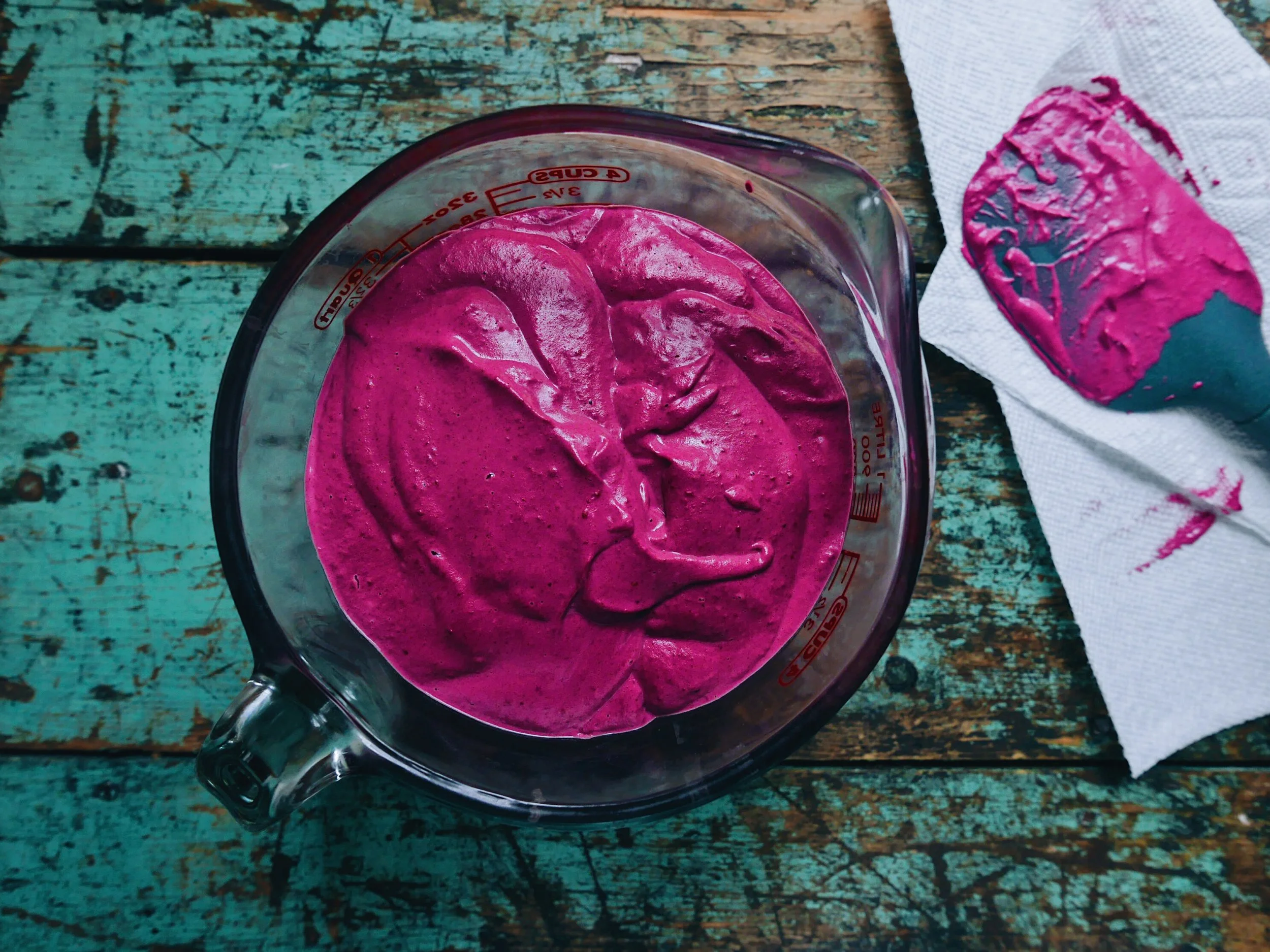 Place your mold on a plate and spread / smooth the crust mix out on the bottom so that it lies flat. Then pour blackberry mousse over it until it reaches the top of the mold.