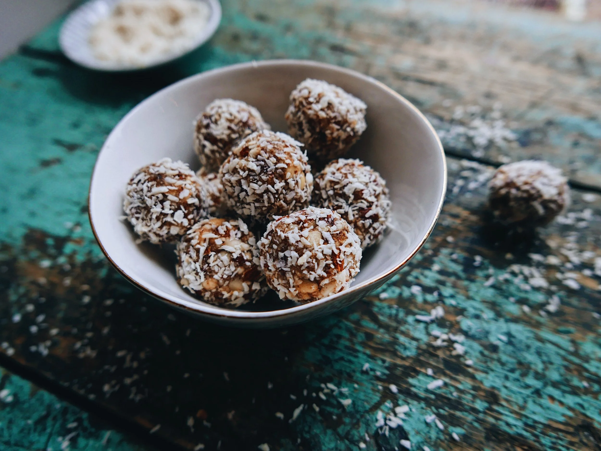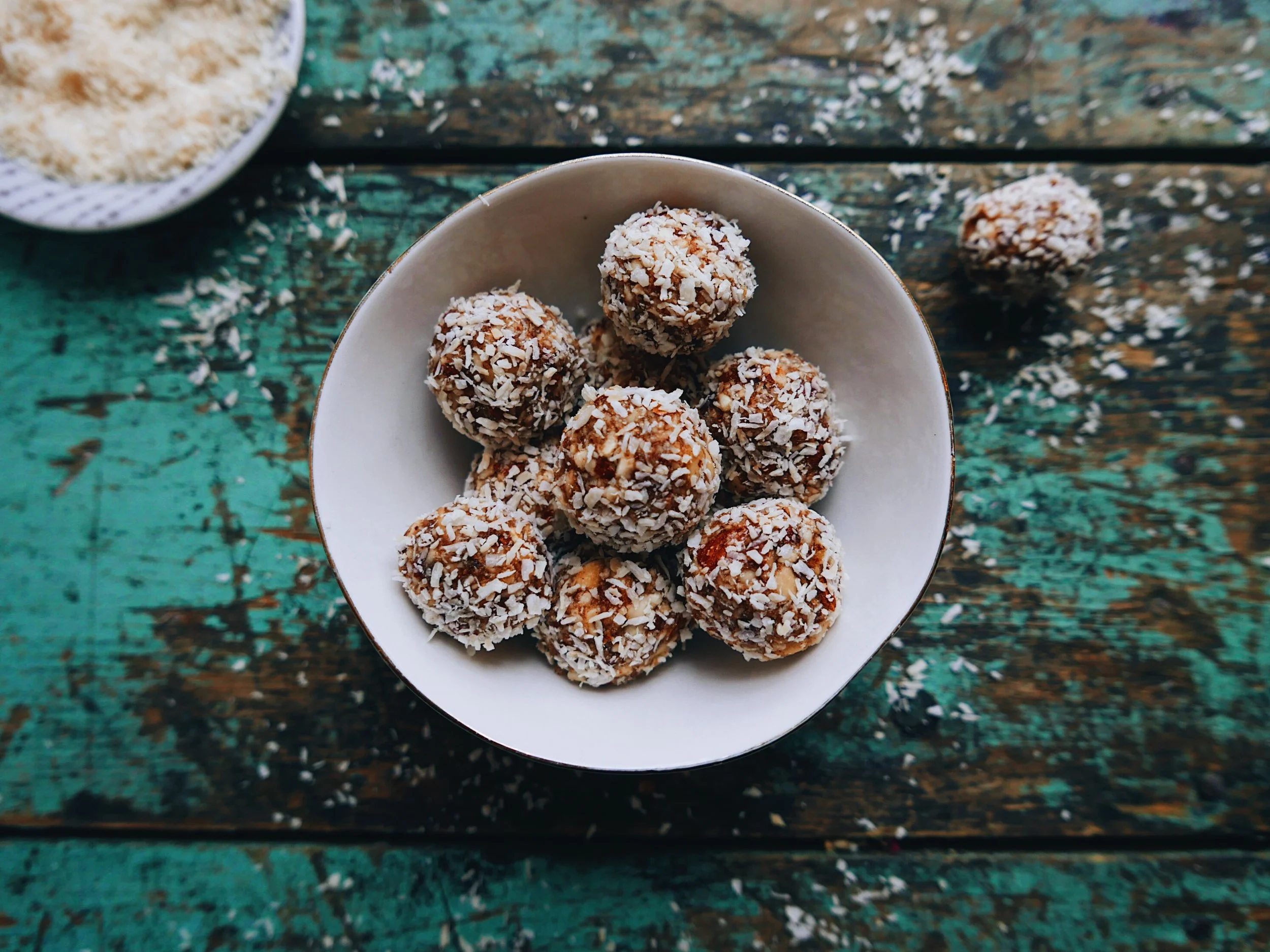 Once the ingredients are well blended and become slightly pasty, (add a splash or 2 more of water to help this along) remove the delicious stickiness and place in a bowl. Roll 1 inch bites in your hand and roll them around in shredded coconut to coat. Store in fridge for up to 3-4 days.
